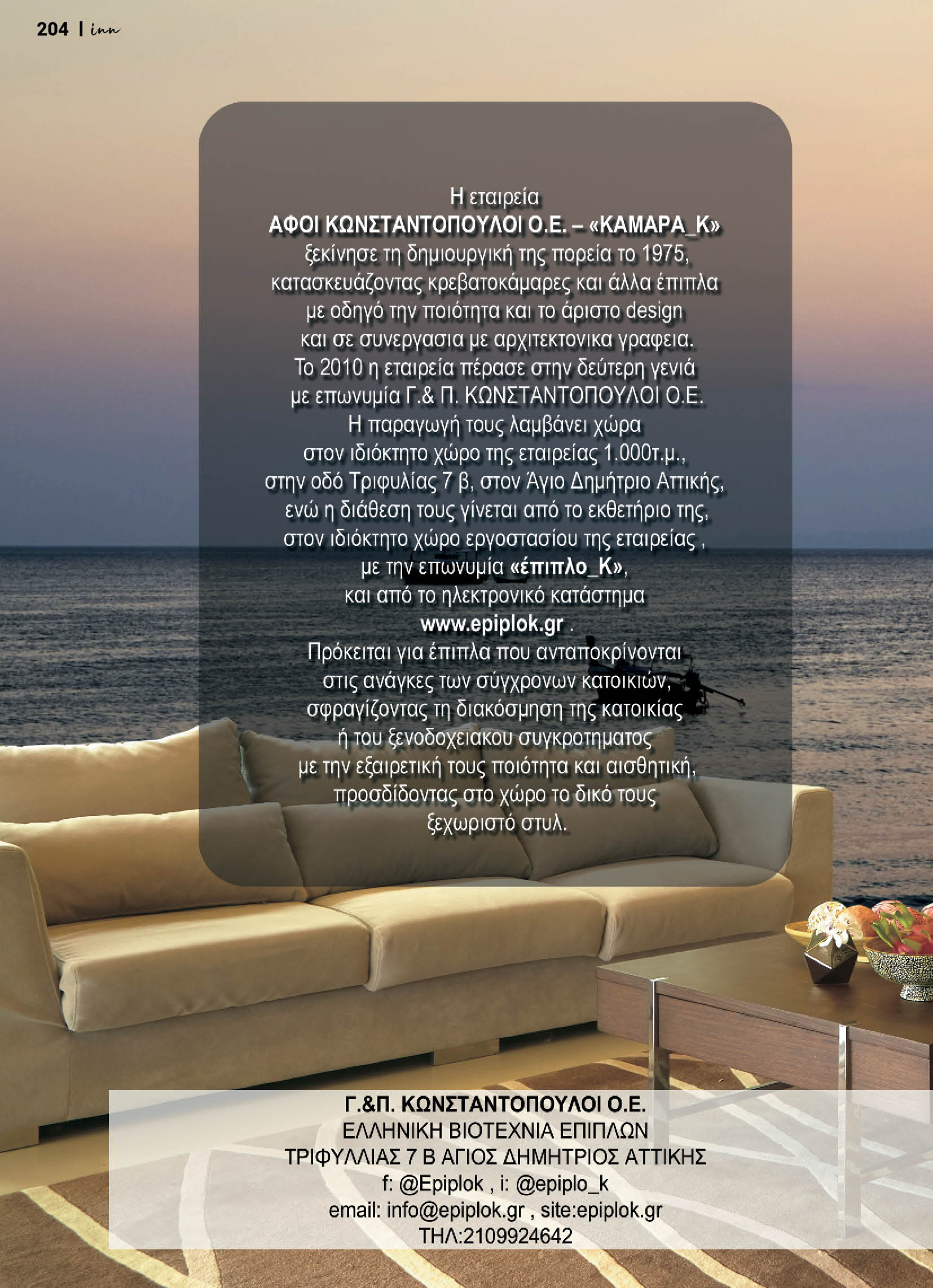 Η εταιρεία ΑΦΟΙ ΚΩΝΣΤΑΝΤΟΠΟΥΛΟΙ Ο.Ε. – «ΚΑΜΑΡΑ Κ» ξεκίνησε τη δημιουργική της πορεία το 1975, κατασκευάζοντας κρεβατοκάμαρες και άλλα έπιπλα με οδηγό την ποιότητα και το άριστο design και σε συνεργασία με αρχιτεκτονικά γραφεία. To 2010 η εταιρεία πέρασε στην δεύτερη γενιά με επωνυμία Γ.& Π. ΚΩΝΣΤΑΝΤΟΠΟΥΛΟΙ Ο.Ε.