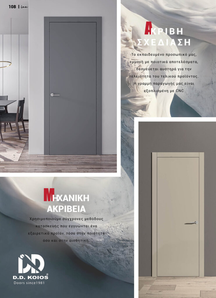 Με την χρήση σύγχρονων τρόπων κατασκευής εγγυάται ένα προϊόν που είναι άριστο, τόπο σε ποιότητα όσο και σε αισθητική. Εσωτερικές πόρτες και ειδικές κατασκευές δημιουργούνται από το σχεδιαστικό τμήμα και παράγονται από το σύγχρονο εξοπλισμό των εγκαταστάσεων της εταιρείας.