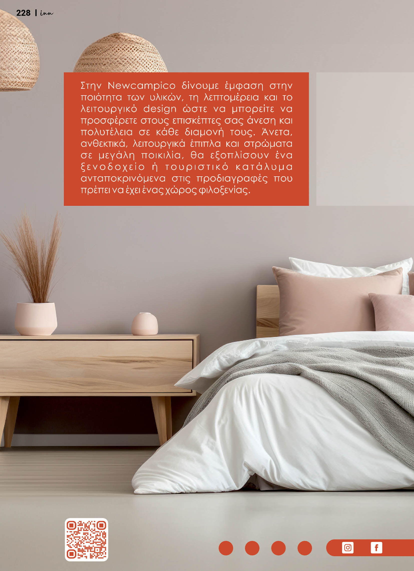 Στην Newcampico δίνουμε έμφαση στην ποιότητα των υλικών, τη λεπτομέρεια και το λειτουργικό design ώστε να μπορείτε να προσφέρετε στους επισκέπτες σας άνεση και πολυτέλεια σε κάθε διαμονή τους. Άνετα, ανθεκτικά, λειτουργικά έπιπλα και στρώματα σε μεγάλη ποικιλία, θα εξοπλίσουν ένα ξενοδοχείο ή τουριστικό κατάλυμα ανταποκρινόμενα στις προδιαγραφές που πρέπει να έχει ένας χώρος φιλοξενίας.