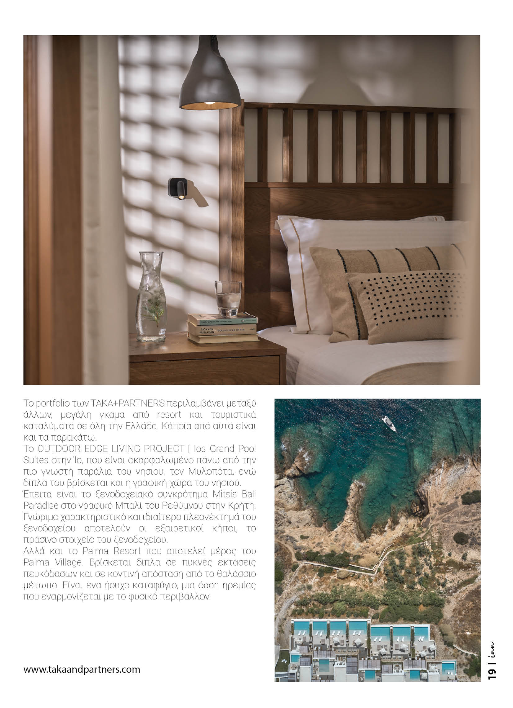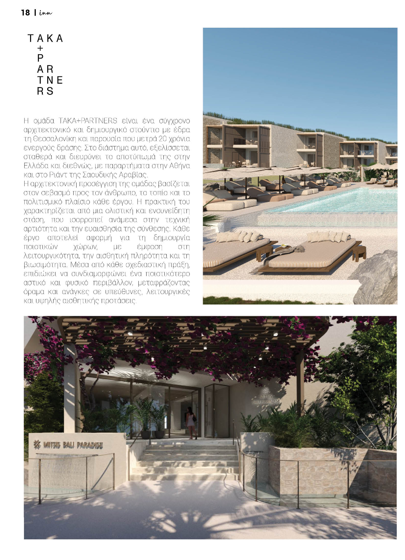 Το portfolio των TAKA+PARTNERS περιλαμβάνει μεταξύ άλλων, μεγάλη γκάμα από resort και τουριστικά καταλύματα σε όλη την Ελλάδα. Κάποια από αυτά είναι και τα παρακάτω. Το OUTDOOR EDGE LIVING PROJECT | Ios Grand Pool Suites στην Ίο, που είναι σκαρφαλωμένο πάνω από την πιο γνωστή παράλια του νησιού, τον Μυλοπότα, ενώ δίπλα του βρίσκεται και η γραφική χώρα του νησιού. Έπειτα είναι το ξενοδοχειακό συγκρότημα Mitsis Bali Paradise στο γραφικό Μπαλί του Ρεθύμνου στην Κρήτη. Γνώριμο χαρακτηριστικό και ιδιαίτερο πλεονέκτημά του ξενοδοχείου αποτελούν οι εξαιρετικοί κήποι, το πράσινο στοιχείο του ξενοδοχείου. Αλλά και το Palma Resort που αποτελεί μέρος του Palma Village. Βρίσκεται δίπλα σε πυκνές εκτάσεις πευκόδασων και σε κοντινή απόσταση από το θαλάσσιο μέτωπο. Είναι ένα ήσυχο καταφύγιο, μια όαση ηρεμίας που εναρμονίζεται με το φυσικό περιβάλλον.